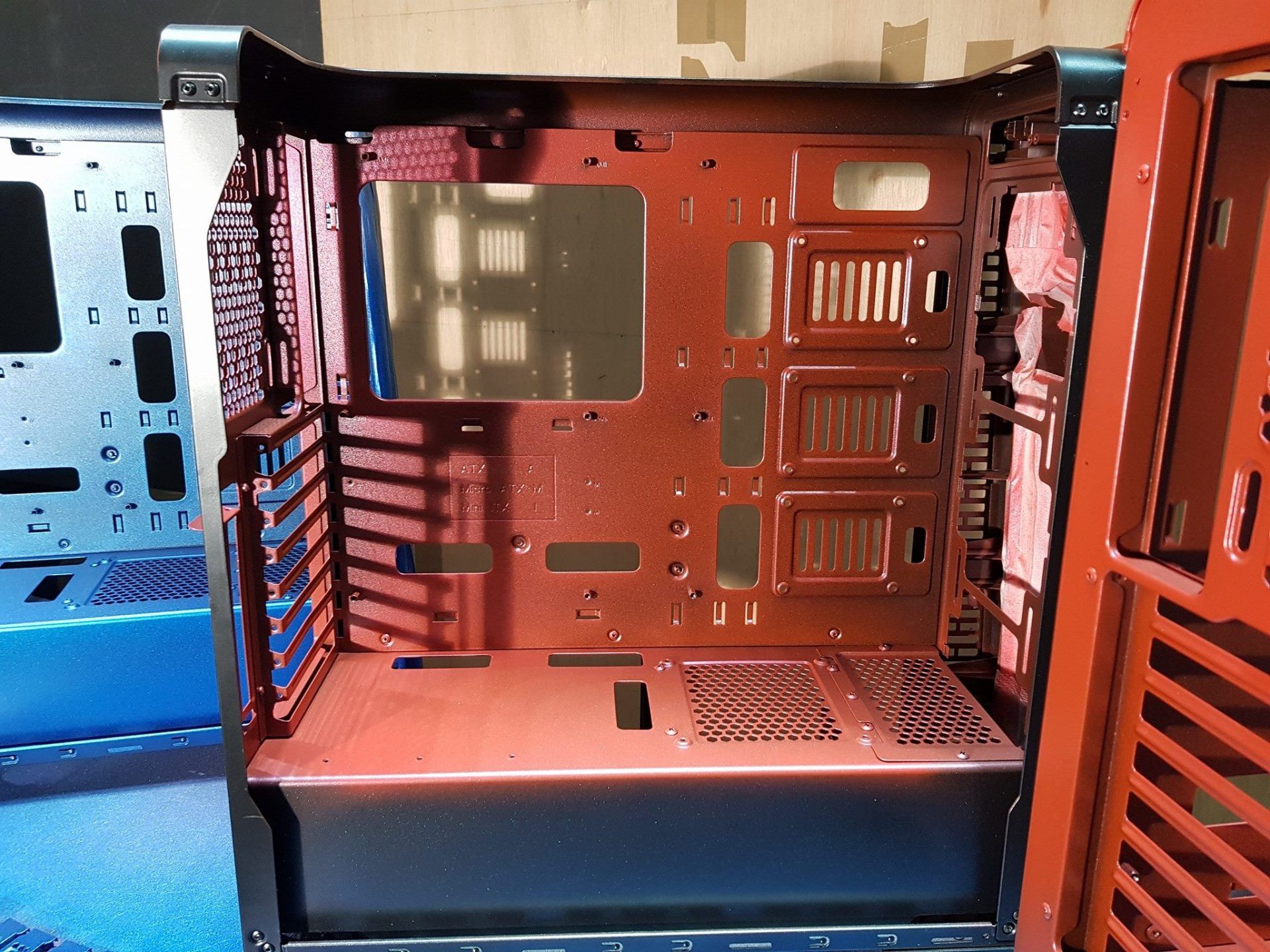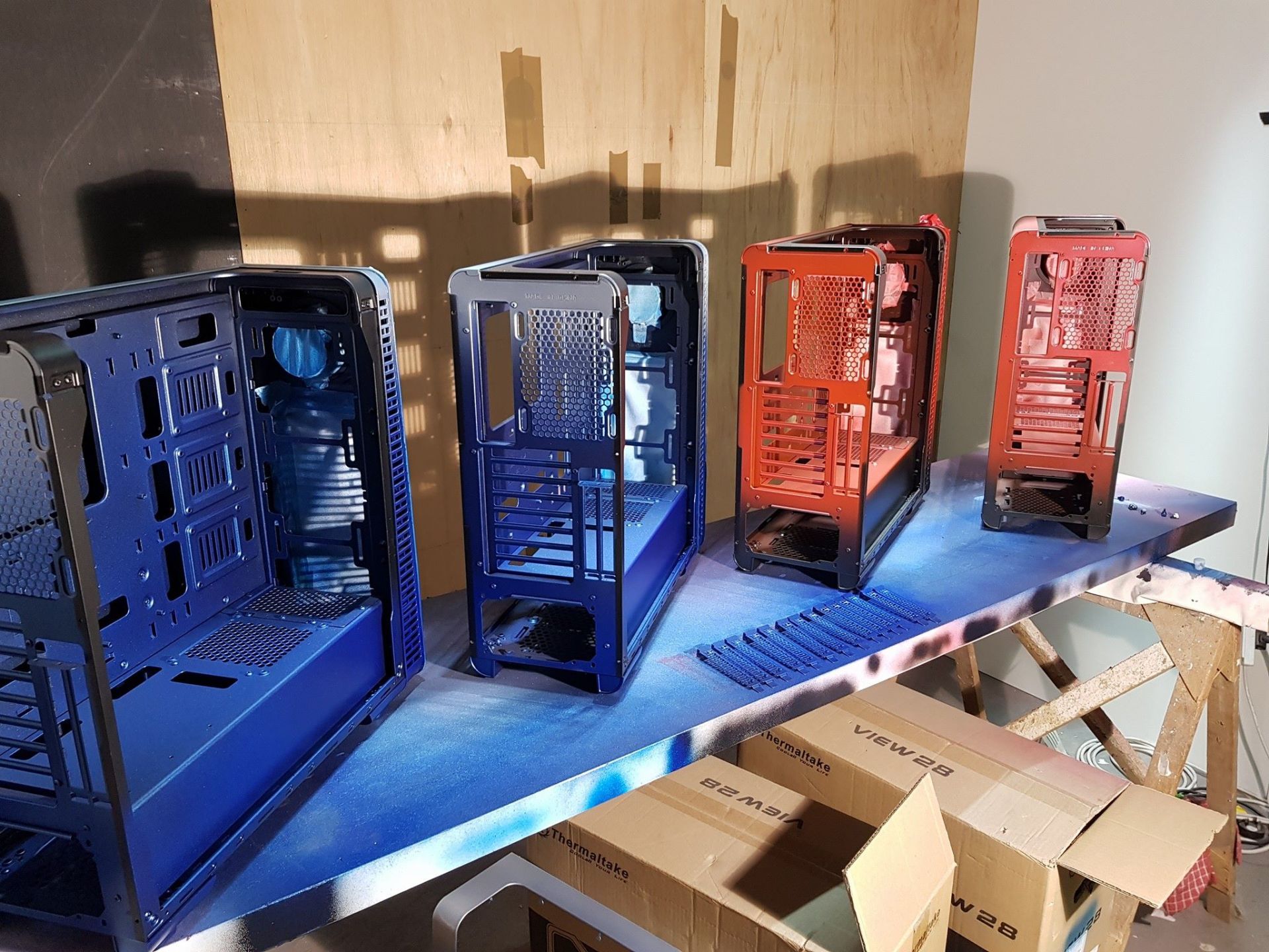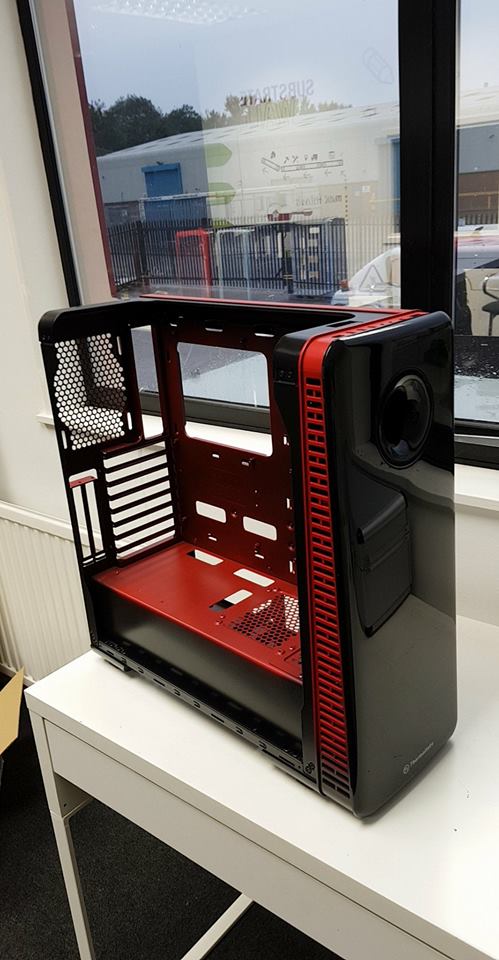 The cases themselves (Thermaltake View 28) again were only released in black initially and that wasn't good enough for the plan I had in mind, as these PC's were to be linked on varying brightly coloured desks at events I used an airbrush and AutoAir paint to closely match the desk counterparts - Giving players at the events the opportunity to play in small Red Vs Blue skirmishes on the Halberd stand space.